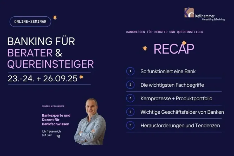 Banking für Berater und Quereinsteiger (Online-Seminar, 2+1 Tage) – Kompakt, praxisnah, verständlich – 23.-24. + 26. September 2025