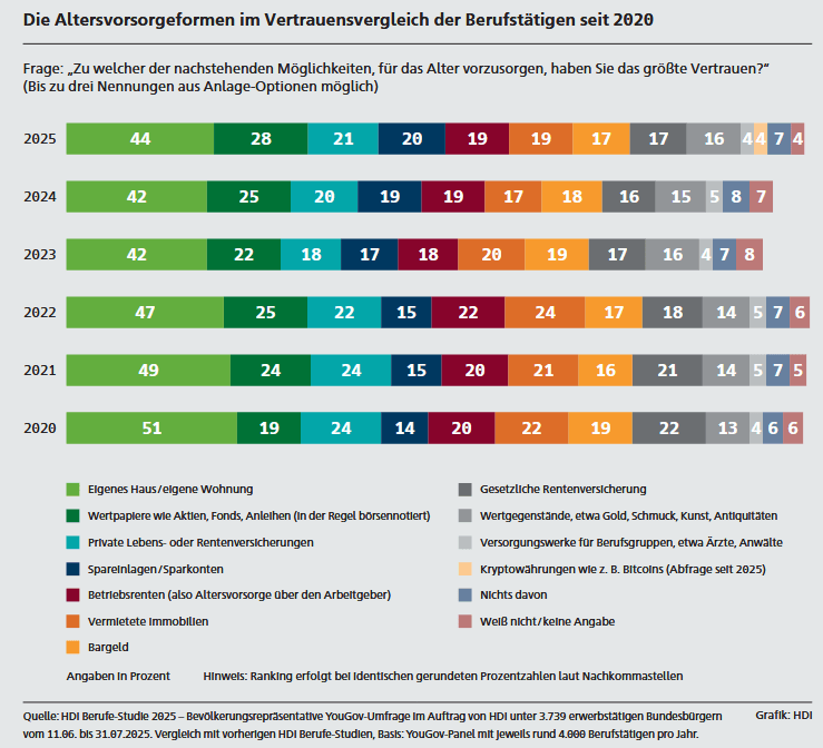 Das Vertrauen in börsengehandelte Wertpapiere wie Aktien oder Fonds als Möglichkeit der Altersvorsorge wächst weiter: 28 Prozent der Berufstätigen in Deutschland bestätigen inzwischen diese positive Einschätzung. Im Vergleich zu 2020 (19 %) ist dieser Anteil um fast die Hälfte gestiegen und erreicht damit den höchsten Stand seit Beginn der Erhebung. Aktien und Fonds belegen somit den klaren zweiten Platz im Vertrauens-Ranking: Nur das Eigenheim mit 44 Prozent wird noch häufiger genannt, wobei der Abstand kontinuierlich schmilzt.