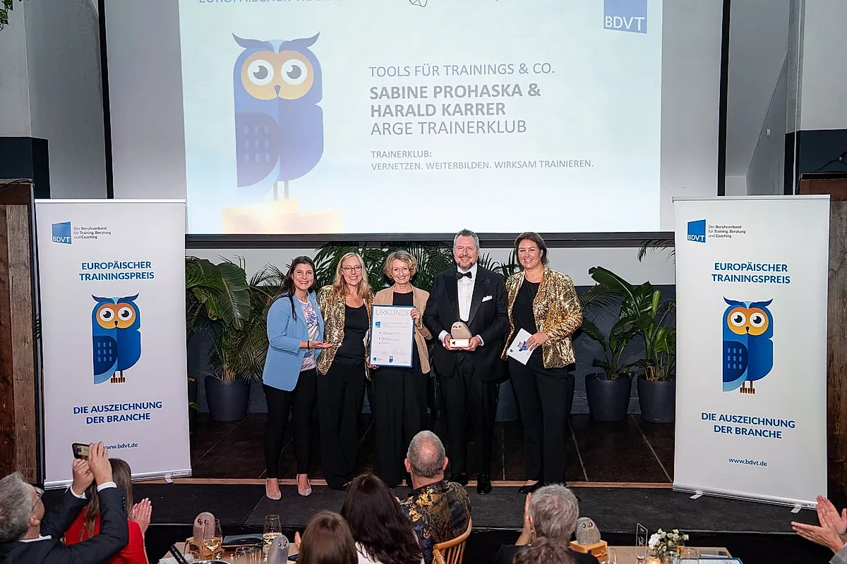 Die Auszeichnung wurde den beiden Plattform-Betreibern Sabine Prohaska und Harald Karrer, beide Wien, während einer Festveranstaltung im Rahmen der Messe Zukunft Personal in München überreicht, bei der auch alle Finalisten ihre Projekte dem Fachpublikum präsentierten. Mit dem Trainingspreis in Gold in der Kategorie „Tools für Training & Co“ wurde der Trainerklub, dessen Slogan „Vernetzen. Weiterbilden. Wirksam trainieren“ lautet, der BDVT-Jury zufolge unter anderem prämiert, weil „dieses Tool eine wichtige Lücke schließt: Unternehmensinterne Fachexpert:innen werden dabei unterstützt, ihr Wissen wirkungsvoll weiterzugeben“. Außer der Wissensvermittlung diene die „zukunftsorientierte Onlineplattform“ dem Schaffen einer „Community, die synchrones und asynchrones Lernen vereint, um die didaktische Kompetenz zu fördern“. Aufgrund der bereitgestellten Lern- und Bildungsangebote sei dieses Tool zudem „äußerst praxistauglich“, zumal bei deren Nutzung „erfahrene Trainer:innen als Sparringspartner zur Verfügung stehen“.