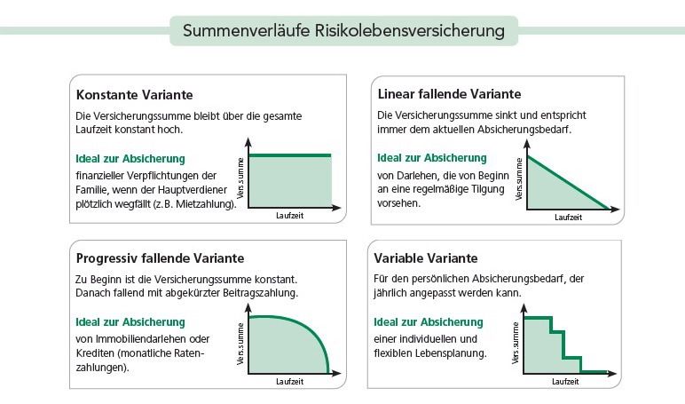 Drei Tarife stehen zur Auswahl: XL, XXL und der „Champion“ XXL plus. XXL und besonders der Spitzentarif XXL plus lassen keine Wünsche offen. Hat man sich für einen Tarif entschieden, muss ein Summenverlauf, der jeweiligen Bedarfssituation entsprechend, gewählt werden: konstant, linear fallend, progressiv fallend oder variabel. Der konstante Verlauf ist geeignet für die Absicherung der Familie oder eines endfälligen Darlehens, der linear fallende Verlauf ebenfalls für die Familienabsicherung mit planmäßig fallender Summe, der progressiv fallende Verlauf sichert einen Immobilienkredit exakt entlang dem Finanzierungsverlauf ab, beim variablen Verlauf ist die Versicherungssumme jährlich zur Hauptfälligkeit frei wählbar. Das Eintrittsalter liegt zwischen 15 und 70 (variabel: 78) Jahren. Die Mindestversicherungssumme beträgt 10.000 Euro, eine Dynamik ist beim konstanten Verlauf zwischen 2 % und 5 % möglich. Durch den Einschluss einer Unfalltod-Zusatzversicherung kann die Versicherungssumme um bis zu 200 % erhöht werden.