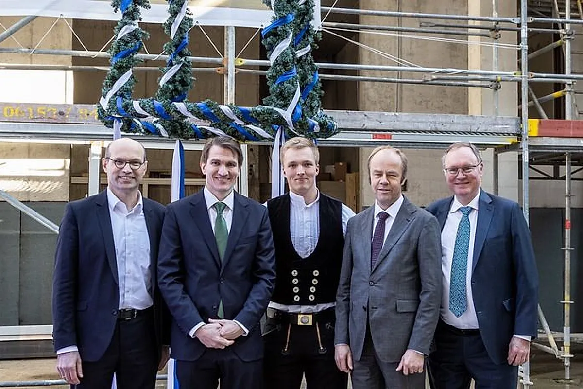 (v.l.n.r.) Gunther Götz (BGF + Architekten), Ralf Werner (Instone), Jonas Schwalm (Dach- und Holzbau Schmidt), Hans-Martin Kessler (Dezernent für Stadtentwicklung u. Bau), Klaus Kirchberger (OFB) / Foto: © Instone Real Estate / Achim Reissner