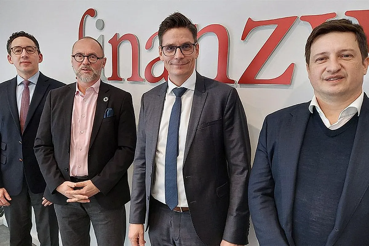 (v.l.n.r.) finanzwelt-Chefredakteur Alexander Heftrich im Gespräch mit Frank Huttel, Michael Blümke und Svilen Katzarski. Foto: © fw