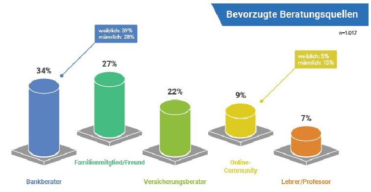 Ein zentrales Hindernis für den souveränen Umgang mit Finanzthemen ist die Angst vor Fehlentscheidungen. Rund die Hälfte der Befragten gibt an, sich durch die Vielzahl an Optionen und die Komplexität der Themen überfordert zu fühlen. Die persönliche Beratung hat auch bei jungen Menschen eine hohe Bedeutung: Rund 70 % wünschen sich eine individuelle Beratung bei der Auswahl von Finanzprodukten – und bevorzugen dabei eindeutig das persönliche Gespräch vor Ort. Besonders stark ausgeprägt ist dieser Wunsch bei jungen Frauen (84 %). Die persönliche Beratung soll dabei vor allem von Bank- und Versicherungsberaterinnen und -beratern kommen. Ein Drittel der Befragten wünscht sich Beratung von Bankfachleuten, gefolgt von Familienmitgliedern und Versicherungsvermittlern. Damit wird deutlich: Junge Menschen wollen fachliche Kompetenz und vertrauensvolle Begleitung – nicht anonyme Online-Tools oder reine Werbebotschaften.