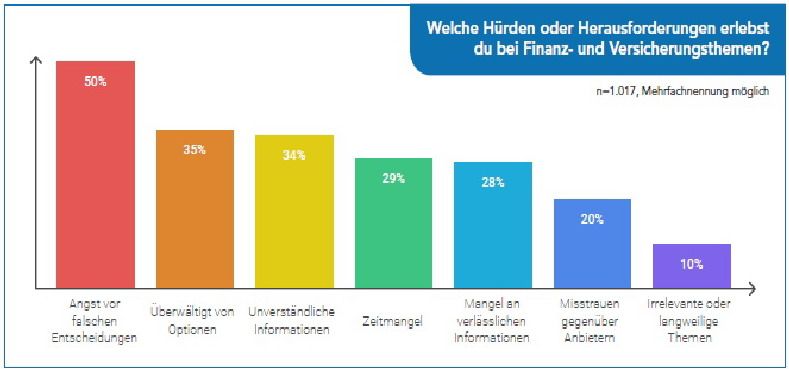 Für die Studie „Financial Literacy – Wie Banken und Versicherungen die jungen Zielgruppen erreichen können“ wurden über 1.000 junge Menschen online zum Stand ihrer Finanzbildung, zu Präferenzen bei ihren Informationsquellen und dazu, was sie sich beim Thema Beratung wünschen, befragt. Ergänzend wurden Tiefeninterviews mit drei Expertinnen aus der Finanzwirtschaft und dem Bildungssektor geführt. Die Gen Z (Jahrgänge 1995 bis 2009) steht, wie schon viele Generationen vor ihr, vor ersten finanziellen Entscheidungen mit Tragweite. Abgesehen vom ersten Konto geht es um Versicherungen, Finanzanlagen bis hin zur Altersvorsorge. Daran ist grundsätzlich nichts neu, doch heute finden viele dieser Entscheidungen digital und individuell statt. Und genau damit hadert die Gen Z und fühlt sich unsicher, denn es bestehen erhebliche Wissenslücken: Nur etwa ein Drittel der Befragten traut sich zu, komplexe Themen wie Versicherungen oder Finanzmarktprodukte gut zu verstehen. Gerade Schülerinnen und Schüler fühlen sich häufig schlecht informiert.
