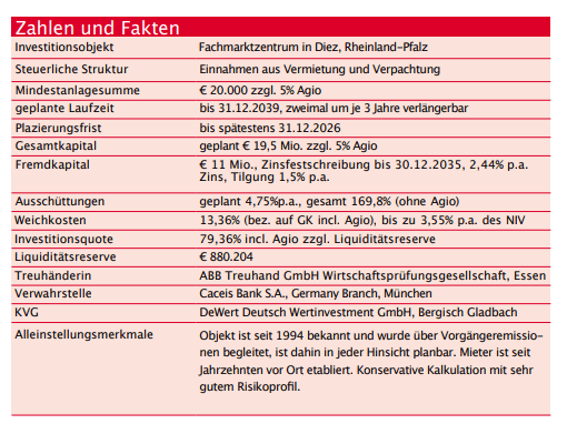 Anleger beteiligen sich an einem Immobilienensemble, einem Fachmarktzentrum, in Diez. Parallel zu den Investoren verbleiben Altinvestoren aus dem Bestand, da die Objekte aus Vorgängeremissionen der Hahn-Gruppe erworben werden. Der Vorteil dabei ist, daß die Objekte in jeder Hinsicht bekannt sind, auch das Verhältnis mit den Mietern vor Ort ist seit Jahren etabliert. Von dieser Seite ist der Fonds also sehr gut planbar. Die Konzeption ist konservativ gestaltet. Die Anbieterin kalkuliert mit ausreichend Puffern für Instandhaltung und Objektverbesserung. Die Fremdfinanzierung (rund 1/3 der Gesamtinvestitionssumme) bietet einen Zinsfestschreibung über 10 Jahre und eine Tilgung von 1,5% p.a. (ab 2027). Anleger sollen Ausschüttungen von 4,75% p.a. erhalten. Im Prospekt sind sehr umfangreiche Sensitivitätsberechnungen enthalten, die die möglichen Auswirkungen von Veränderungen der unterschiedlichen Prognoseparametern erläutern. Unter dem Strich bietet der Fonds damit eine konservative Kalkulation mit einer langen geplanten Laufzeit (Ende 2039) und entsprechender Rendite.