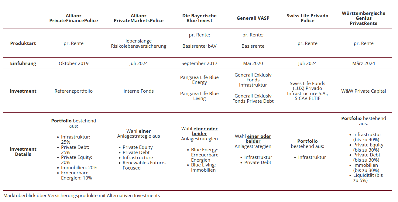 Deutsche Versicherer gelten als Vorreiter bei Investitionen in Alternative Investments: Seit vielen Jahren bauen sie entsprechende Kapitalanlagen im Sicherungsvermögen auf und verfügen über gewachsene Expertise in diesem Segment. In den vergangenen Jahren hat die Bedeutung weiter zugenommen. Parallel dazu hat die Branche produktseitig nachgelegt: Lösungen sind bei die Bayerische, Allianz, Generali, Swiss Life und Württembergische verfügbar. Die Produkte unterscheiden sich jedoch deutlich in Struktur und Strategie und sind damit kaum direkt vergleichbar – für nahezu jede Zielgruppe existieren passende Ausprägungen. „Der langfristige Charakter Alternativer Investments passt ideal zum Wesen der Altersvorsorge“, so Kick.