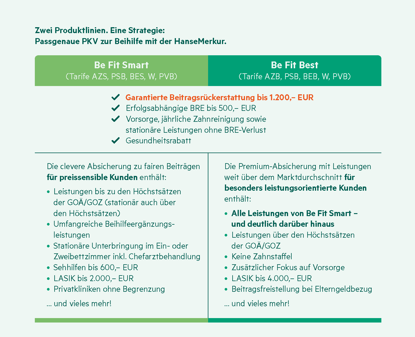 Be Fit Smart positioniert sich als clevere Lösung für preissensible Beamte mit solider Leistungsbasis etwa bei Sehhilfen, LASIK oder der Behandlung in Privatkliniken. Be Fit Best richtet sich an besonders leistungsorientierte Kunden und geht deutlich über den Marktdurchschnitt hinaus: Erstattungen über den Höchstsätzen der GOÄ und GOZ, keine Zahnstaffel, zusätzlicher Vorsorgefokus, höhere LASIK-Budgets sowie eine Beitragsfreistellung bei Elterngeldbezug.