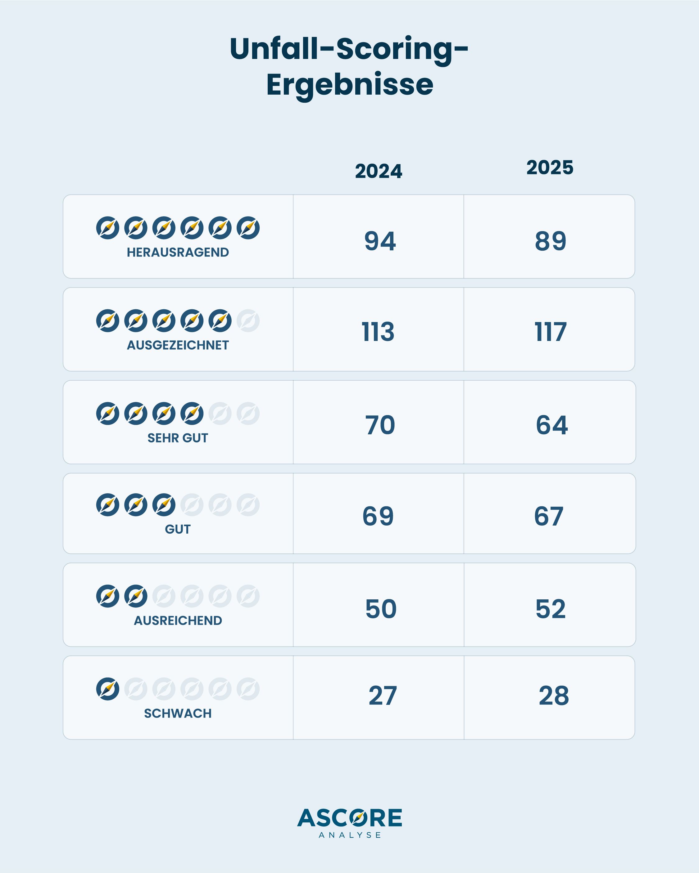 Ascore Analyse hat den Unfallversicherungsmarkt erneut durchleuchtet und 417 Tarife aus 50 Gesellschaften untersucht. Das Scoring umfasst insgesamt 50 bewertungsrelevante Score-Kriterien und 65 zusätzliche, nicht-bewertungsrelevante Kriterien.