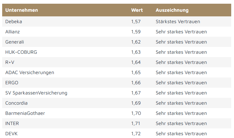 Der Branchenmittelwert für „Versicherer“ liegt derzeit bei 1,87. Debeka erzielt mit einem Wert von 1,57 die Bestnote „stärkstes Vertrauen“ in der Branche. 10 Versicherer erhielten die Auszeichnung „sehr starkes Vertrauen“, 13 „starkes Vertrauen“.