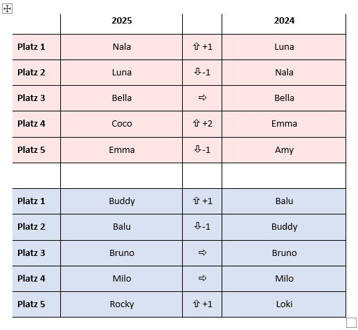 Bei den beliebtesten Namen für Hündinnen und Rüden gibt es gegenüber dem Vorjahr kaum Veränderung, berichtet Franziska Obert von der Agila Haustierversicherung. „Die Top 3 bei den Hündinnen waren 2024 Luna, Nala und Bella. Dieses Jahr rangiert Nala auf dem ersten Platz, gefolgt von Luna und Bella. Ähnlich sieht es bei den Rüden aus: 2024 lag Balu auf Platz 1, gefolgt von Buddy und Bruno. Dieses Jahr ist Buddy einen Rang nach oben geklettert. Balu ist der zweithäufigste Name, Bruno belegt nach wie vor Rang 3.“