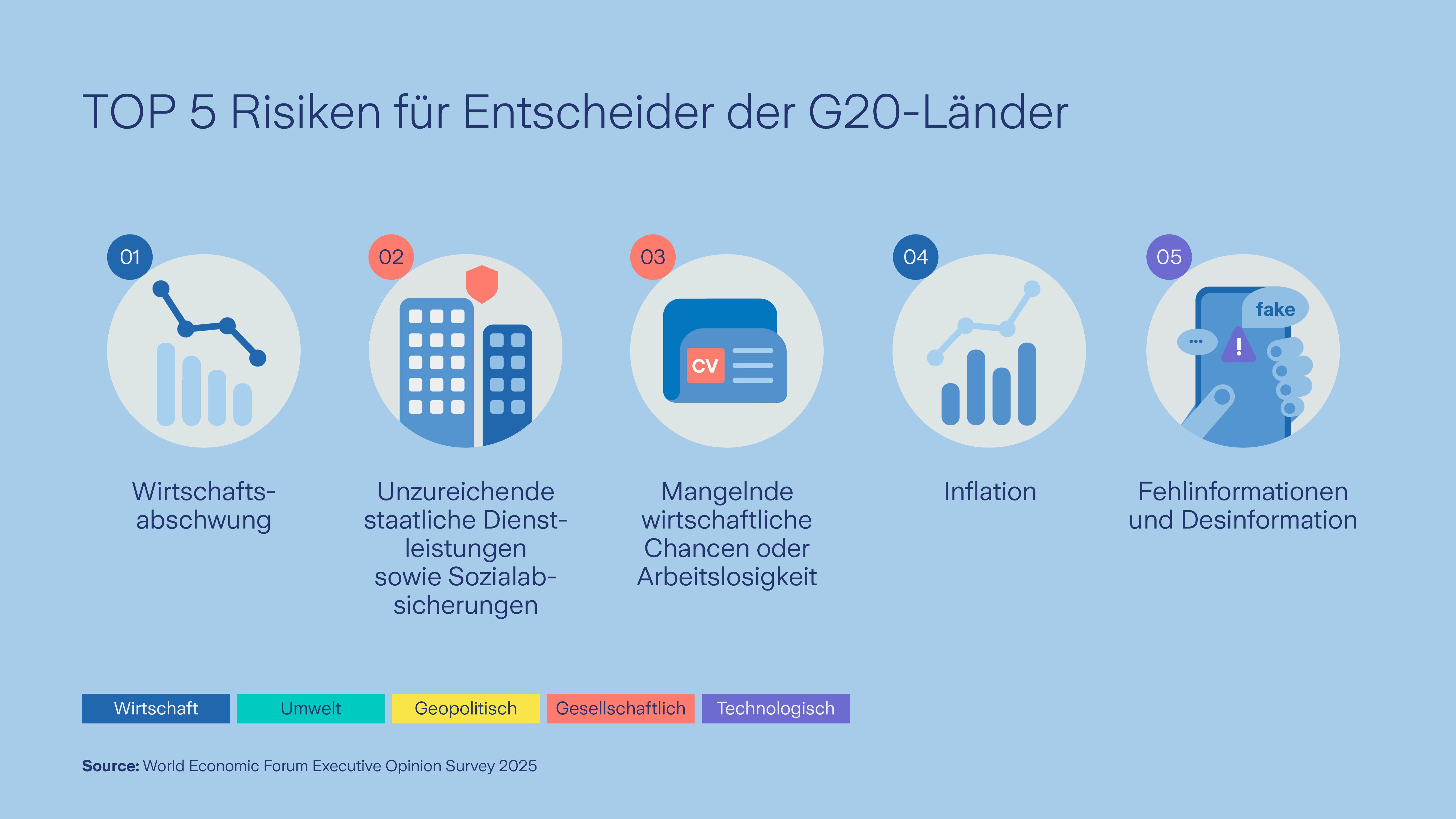 Die Executive Opinion Survey zeigt jährlich die fünf größten Risiken für die nächsten zwei Jahre auf, die von mehr als 11.000 Top-Entscheidern aus 116 Ländern identifiziert wurden. Die Ängste vor einem wirtschaftlichen Abschwung dominieren auch in der jüngsten Erhebung die Bedenken der G20-Top-Entscheider. Damit führen sie zum dritten Mal in Folge die Gesamtliste an.